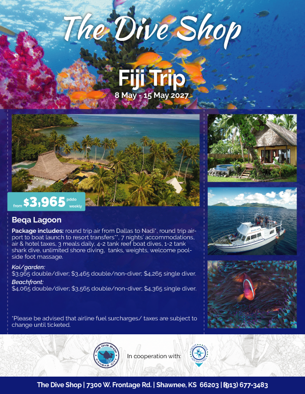 Beqa Lagoon Package includes: round trip air from Dallas to Nadi*, round trip airport to boat launch to resort transfers**, 7 nights’ accommodations, air & hotel taxes, 3 meals daily, 4-2 tank reef boat dives, 1-2 tank shark dive, unlimited shore diving, tanks, weights, welcome poolside foot massage.