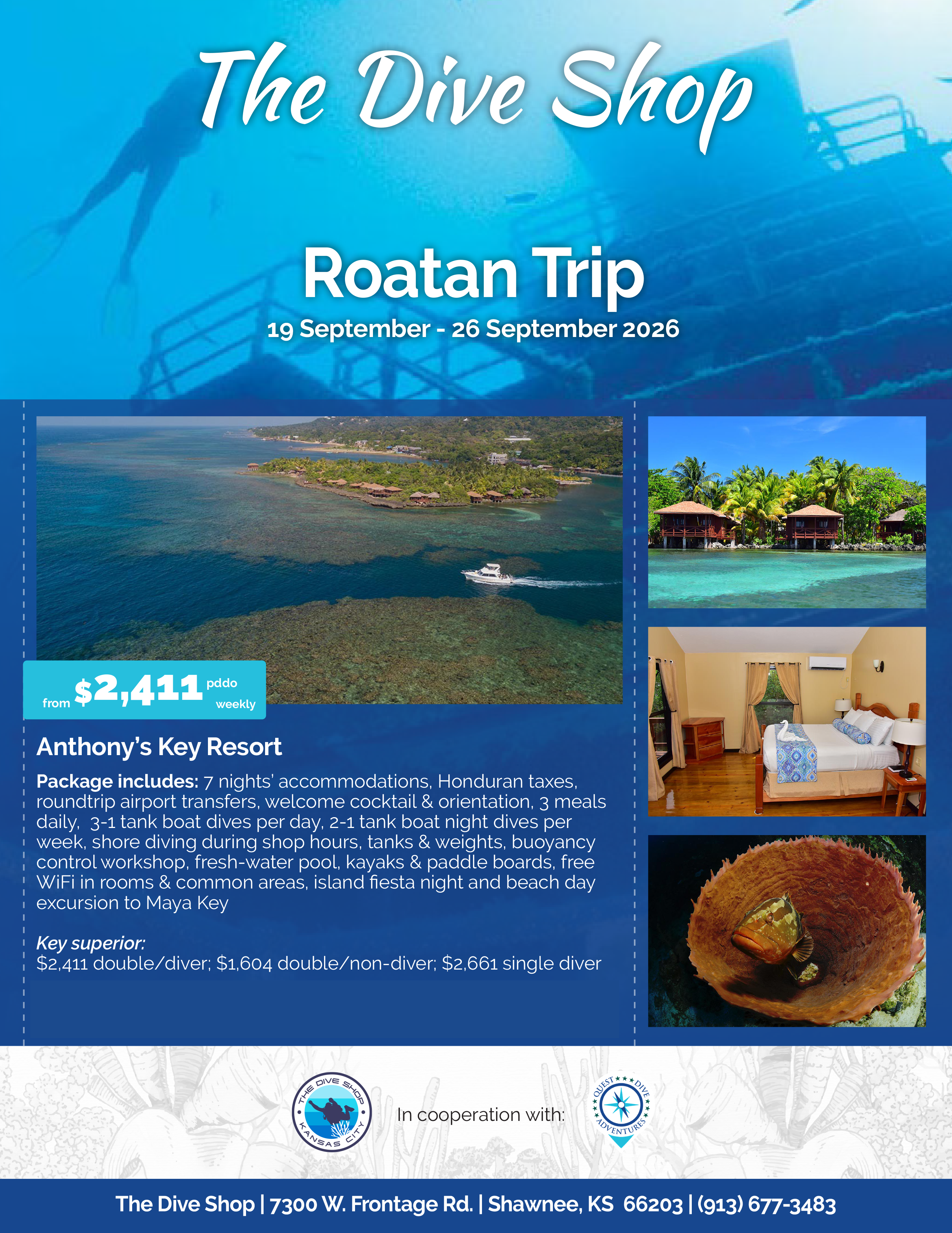 7 nights’ accommodations, 3 meals daily*, roundtrip airport transfers, welcome cocktail & orientation, 3 single tank boat dives per day, 2 single tank boat night dives per week, shore diving during shop hours, tanks & weights, buoyancy control workshop, fresh-water pool, kayaks and paddle boards, free wifi in rooms and common areas, island fiesta night on Anthony’s Key, Beach Day excursion to Maya Key, and taxes.